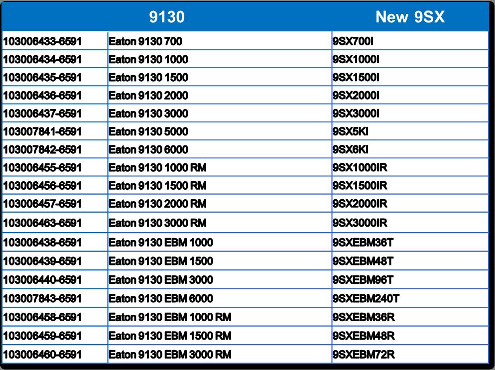 Таблиця відповідності моделей 9130 новим ДБЖ серії 9SX:
