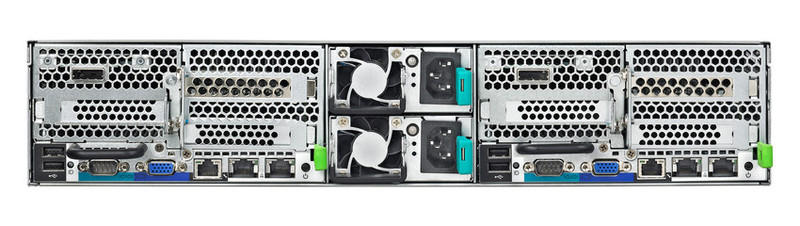 Fujitsu PRIMERGY CX420 S1 – это двухузловой кластер, работающий под управлением Microsoft Windows Server 2012. Собственно CX420 S1 – это шасси высотой 2U, в которое устанавливаются два серверных узла. Каждый узел – это сервер PRIMERGY CX272 S1, включающий пару современных (вплоть до 8-ядерных) процессоров Intel® Xeon® E5-2600 (поддерживаются ЦП от E5-2603 до E5-2680). Процессор поддерживает четырехканальный обмен данными с памятью, всего каждый узел позволяет установить 16 модулей емкостью до 16 Гбайт, что дает максимально 256 Гбайт ОЗУ на узел.