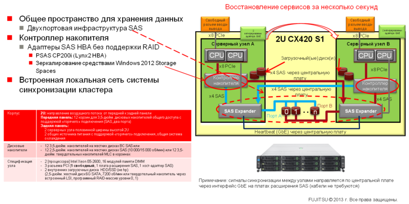 «В лице» Fujitsu PRIMERGY CX420 S1 пользователи получают компактный (2U) и недорогой кластер высокой готовности с хранилищем совместного доступа, и при этом без необходимости использовать внешнюю СХД. Кроме экономии на самом оборудовании, партнер сможет сэкономить и на обслуживании, так как система рассчитана на работу под управлением Windows Server 2012. Она не потребует от обслуживающих ее инженеров специальных знаний в области отказоустойчивости и кластеризации.
